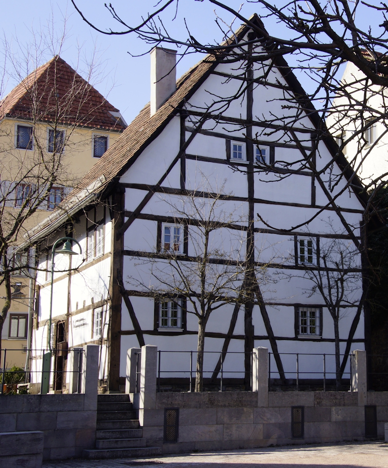 In den 1980er Jahren wurde das „Firstsäulenhaus“ an der Oberen Vorstadt 33 abgebaut und hierher verlegt. Diese unscheinbare, kleine Gebäude ist baugeschichtlich von größter Bedeutung, da es in ganz Nordwürttemberg das einzige bekannte Firstsäulenwohnhaus ist. Wir haben in ihm einen späten Vertreter einer uralten Bauweise vor uns, bei der die Haupthölzer des Hausgerüstes an einem Stück das ganze Haus durchziehen. Die Eck- und Hauptständer reichen vom Boden bis zu der entlang dem Hausfirst ziehenden Firstpfette.