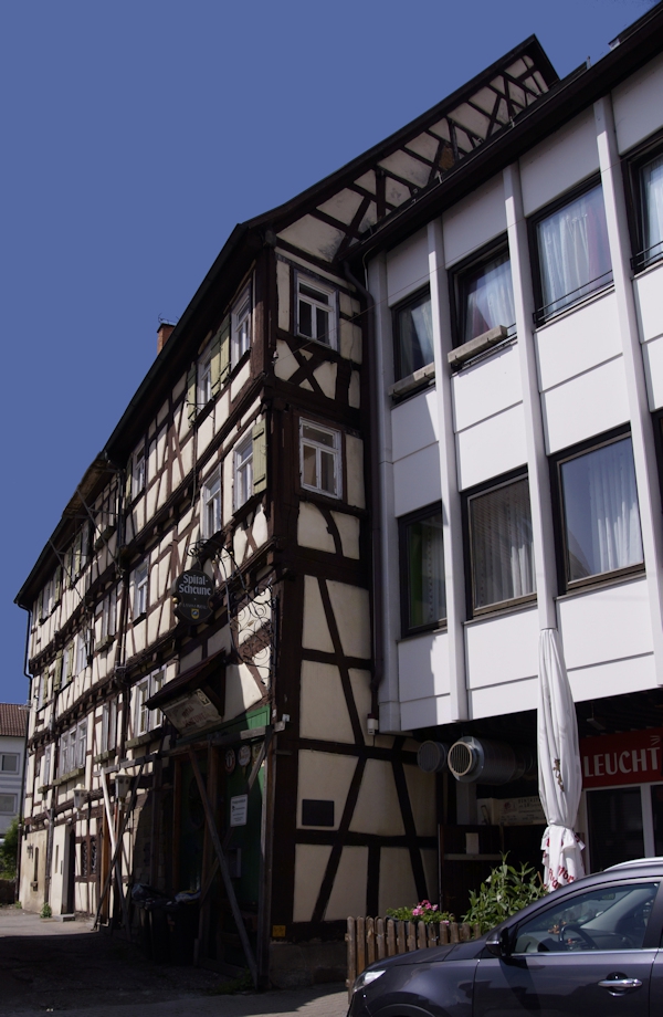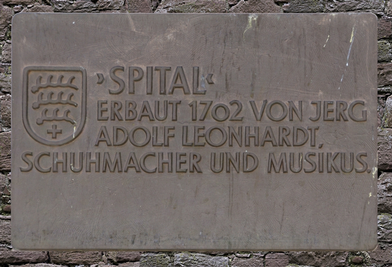 Das sogenannte Spital (heute Spitalscheune) von 1702 führt seinen Namen nicht von einer mittelalterlichen Einrichtung. Zwar hatte der Bauherr Jerg Adolf Leonhardt, Schuhmacher und Musikus, einen „Chirurgus“ als Sohn, doch scheint der Name eher daher zu rühren, dass in dem großen Haus schon bald vier verschiedene Familien wohnten. Auch andern Orts wurden solche stark belegten Häuser als Spital oder Kaserne bezeichnet. Das Haus stand ursprünglich mit der Nord- und Westseite auf der Stadtmauer. Zwei Pfosten des obersten Geschosses auf der Nordseite tragen außer dem Baujahr die Namen des Bauherren und des Zimmermanns.