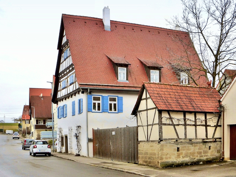 Bei der Hofanlage handelt es sich um einen typischen Dreiseithof: Das Wohnstallhaus auf der einen Seite, im Hintergrund die Scheune und auf der anderen Seite die im Schwäbischen oft gefundene Kombination aus unten Schweinestall und oben Holzhütte. Leider verhindert ein hohes Hoftor den Einblick in diese Hofanlage.
