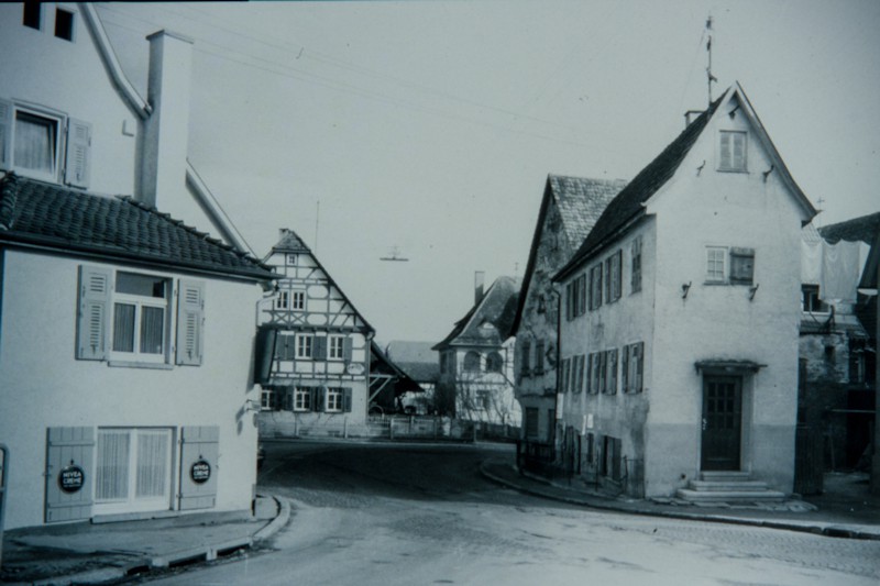 Dem Brandstifter fielen 1973 auch Häuser auf dem heutigen Dorfplatz zum Opfer. Dies und die räumliche Enge war Anlass den Platz neu zu gestalten. Vor dem Dorfbrunnen steht die alte Schule - Ursprung 1776 bis zum Neubau 1953 an der Olgastr. an die einst auch das „Kinderschüle“ - die Kita - angebaut war.