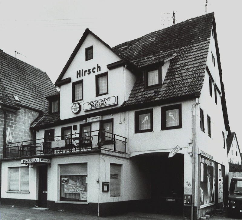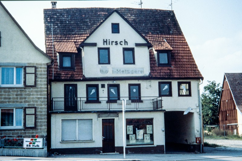 Hirschplatz mit Gaststätte Hirsch (heute Kreissparkasse) und Dorfbrunnen