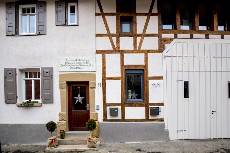 Die Doppelscheune mit altem Saustall von 1474 ist eines der ältesten Gebäude von Darmsheim. Innen führt eine schwindelerregende Leiter auf den obersten Heuboden. Die Einrichtung im Innern, mit Hunderten von Garbenstricken, vermittelt ein unverfälschtes Bild der alten Zeit.
